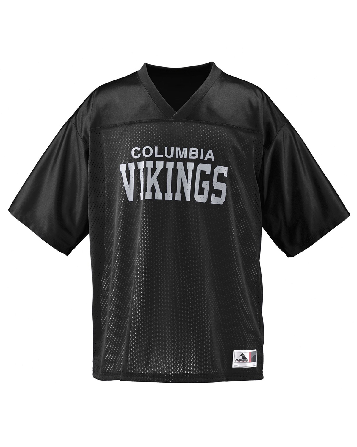 3.4 oz., 100% polyester tricot mesh ; 100% polyester dazzle fabric yoke and sleeves; 1x1 rib-knit modified V-neck collar; Front and back yoke large enough for embellishment; Set-in sleeves; Outside locker label with size on left side near bottom hem; Double-needle hemmed sleeves and bottom
